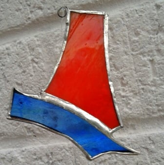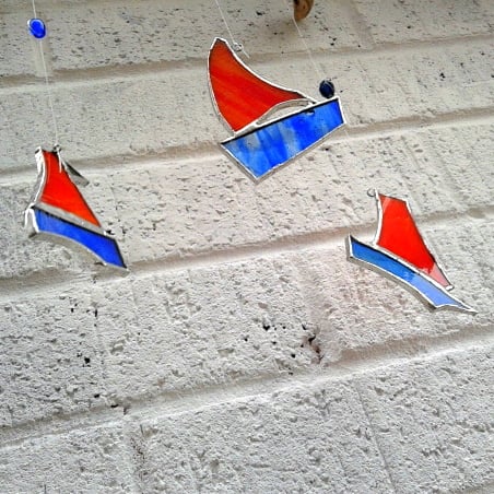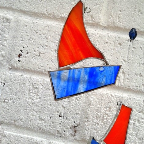 I started making these boat mobiles about 3 years ago and they have sailed to galleries all over the UK! They are made from pieces of waste stained glass (which would otherwise be thrown away) pieced together into boat shapes and then copper foiled and soldered together. Each boat is unique and each mobile has its own charm. This one is very vibrant and the colours make me smile