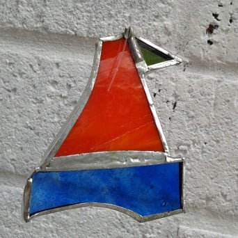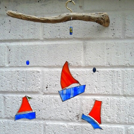 Made from recycled waste stained glass this lovely boat mobile is wonderfully vibrant and the 3 little boats spin and bob in the breeze. Constructed using the copper foil/Tiffany technique and hung on driftwood from a local beach its a lovely addition to a beach themed room, bathroom or a boys bedroom