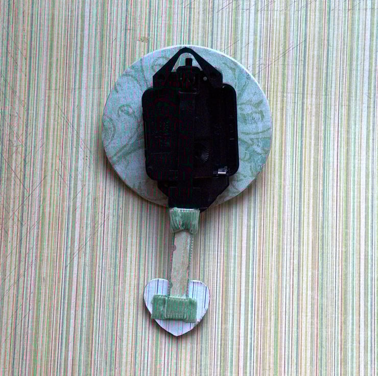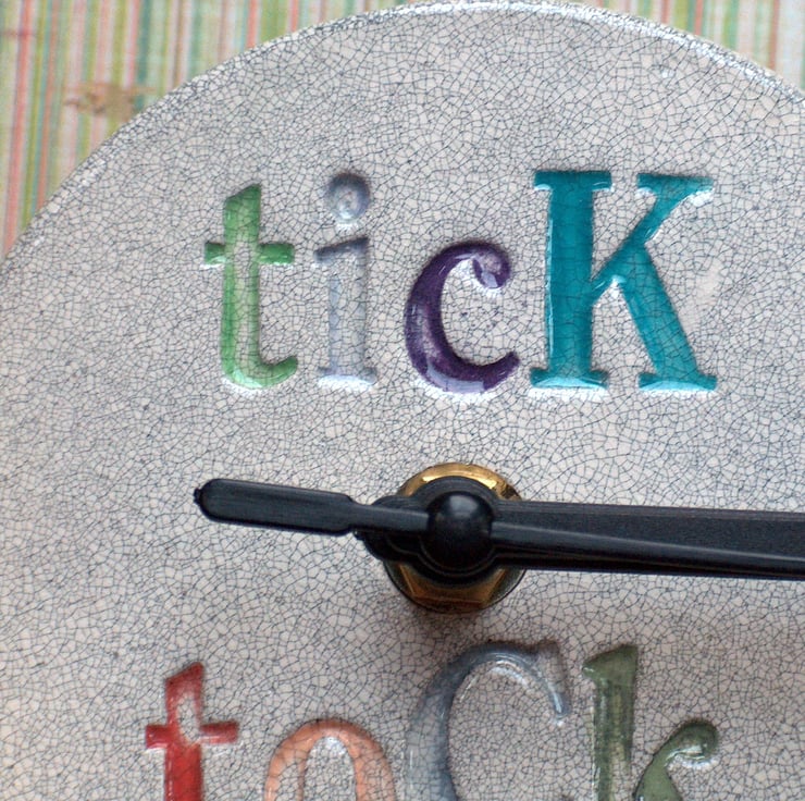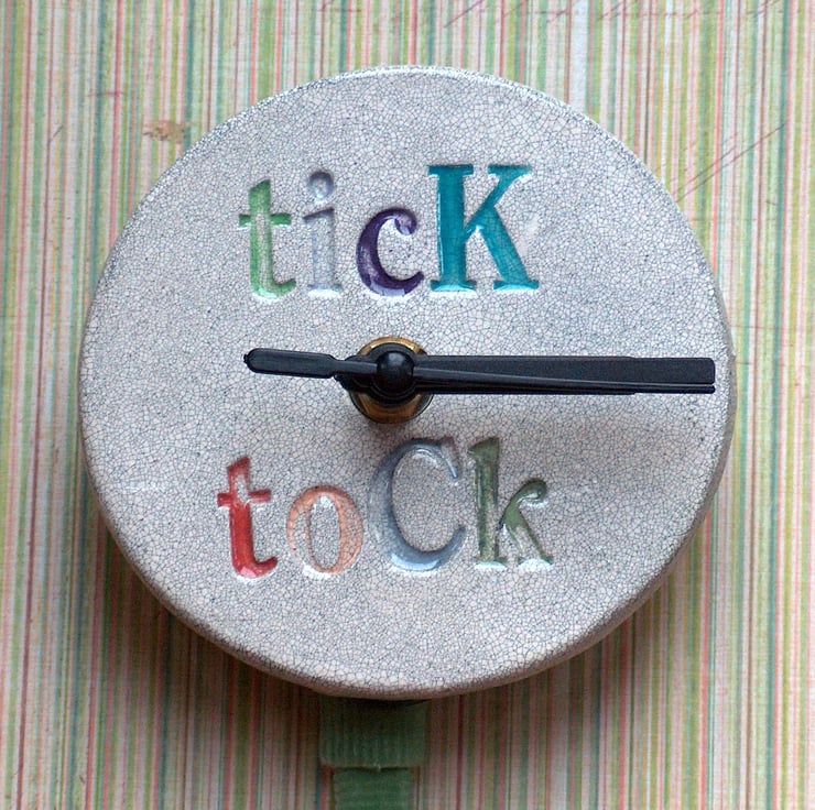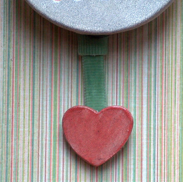 This is another one of my little pendulum clocks. The words 'Tick Tock, are embossed on the face of the clock with my vintage stamps, all in different coloured underglazes. The litle pendulum is a little heart, which swings from side to side as the clock goes about it's business. The whole thing is finished in my trade mark crackle glaze.