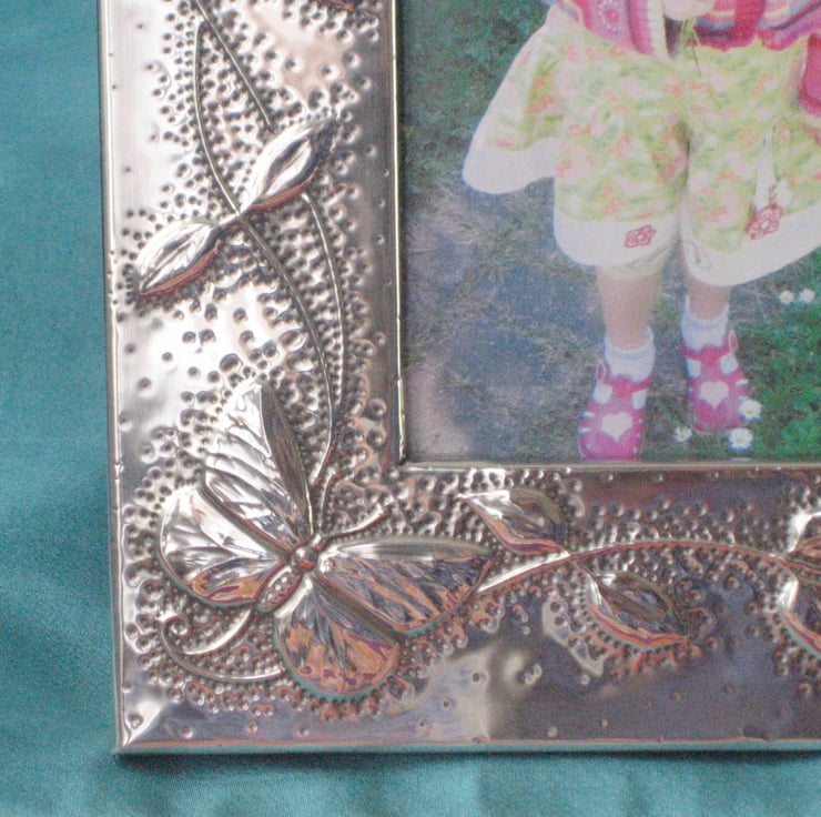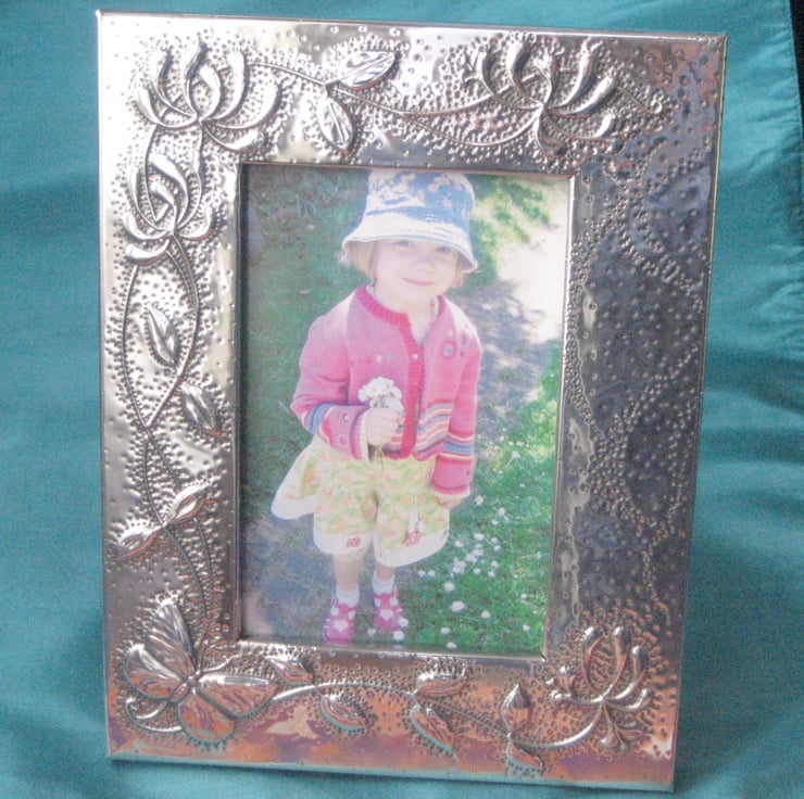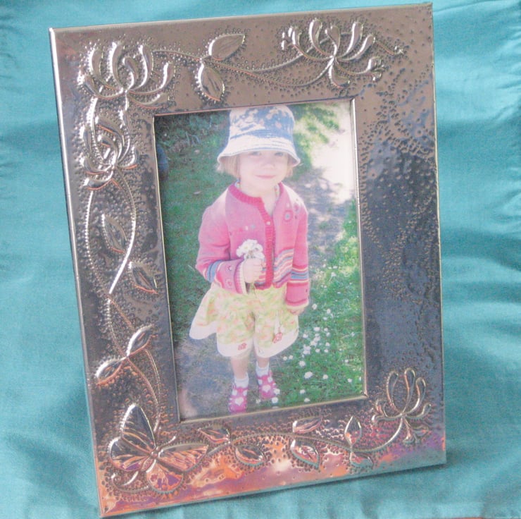 This striking frame has been hand-made in shiny modern pewter to my original design of butterfly and honeysuckle. Measuring 173 x 220mm overall, it will take a photograph a fraction under 4 x 6 inches. The reverse, which is covered in black velour, has a stand, and and a ring for hanging.