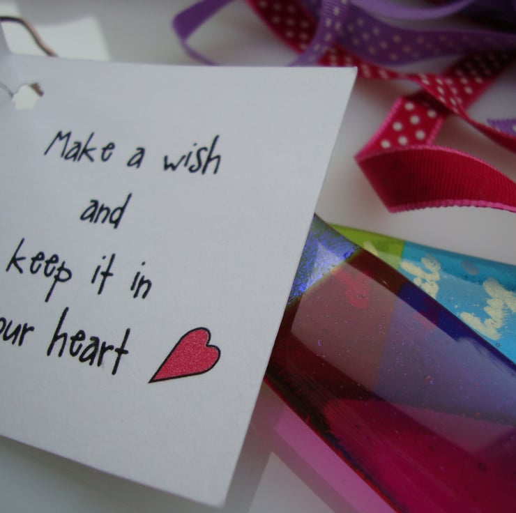 hanger 1 is pink fused glass with sparkle and the words a wish to brighten up your day and measures 25cm x 2.5cm