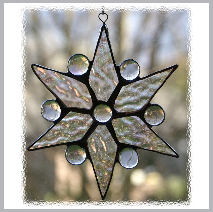 It is a Snowflake Star made with clear, textured iridescent glass so it sparkles in the light. At the centre is a clear glass nugget and there are 6 nuggets between the points, 3 iridescent and 3 with white snowy swirls.