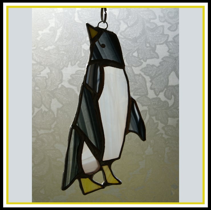 The suncatcher hangs from a little chain which is securely attached to the top of the penguin's head. It is 12cm high and 7cm wide.