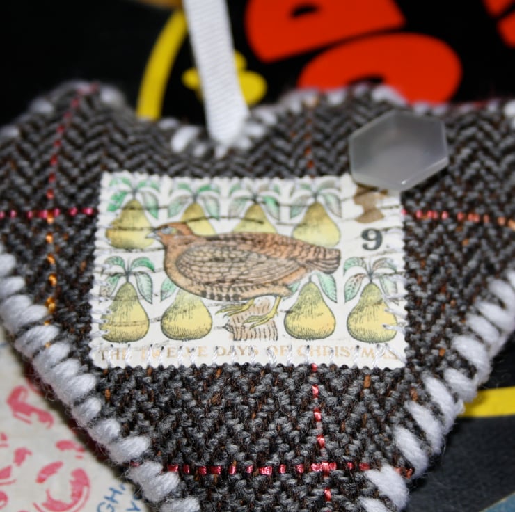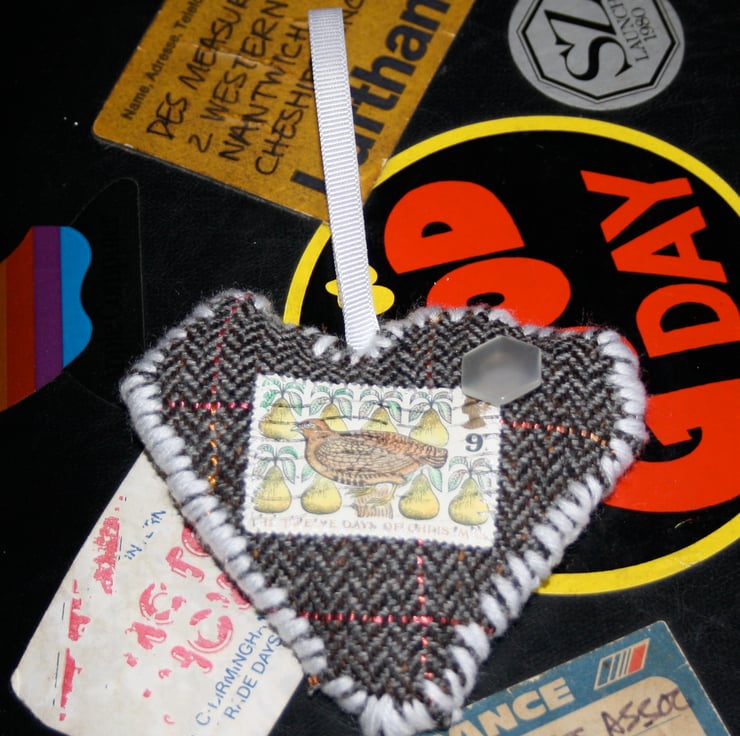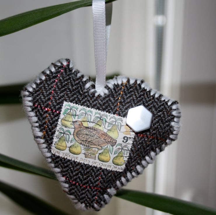 Vintage stamp Christmas decoration, handmade with love using a grey and pink check fabric in a heart shape with a vintage stamp featuring the twelve days of Christmas, Partridge in a Pear tree and a white cute button all hand stitched with white cotton and a white wool hand stitched edge. The decoration has a white ribbon handle to hang on your christmas tree and bring a bit of handmade charm to your Christmas.