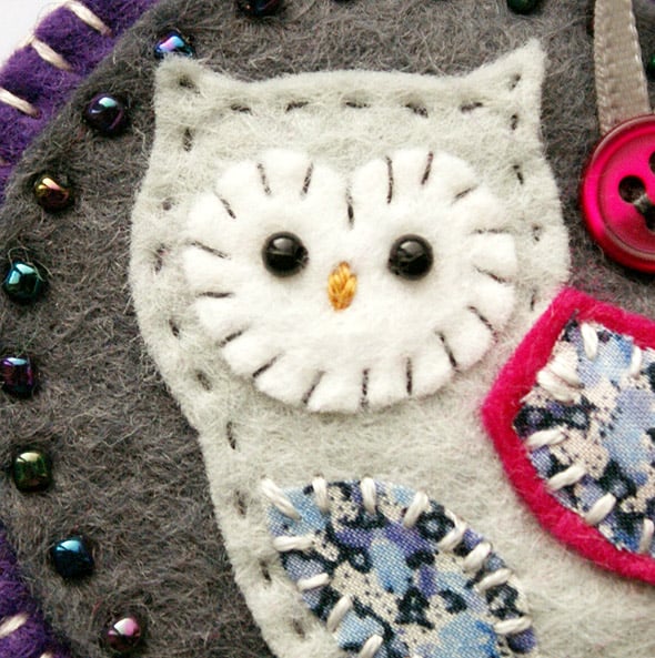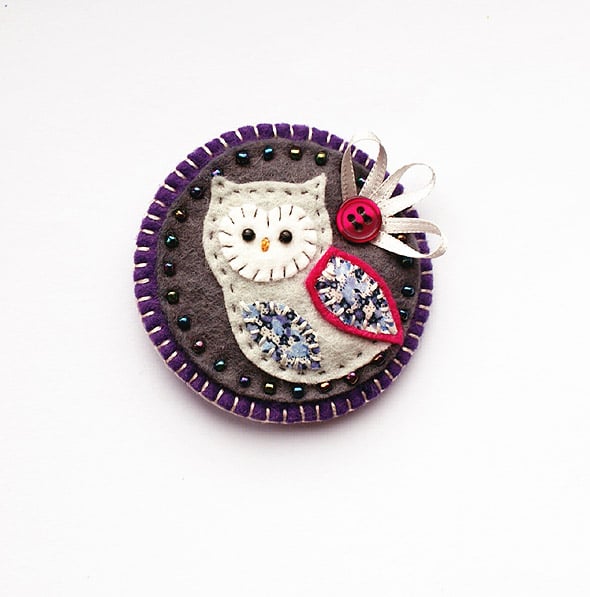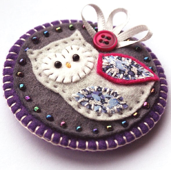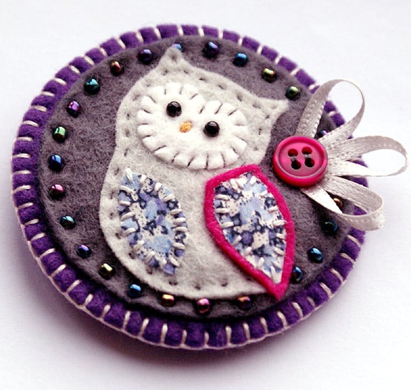 It features a little felt owl with appliqued wing and belly in pretty blue Liberty print tana lawn fabric. It is mounted onto a grey felt base which is edged with pretty coordinating seed beads. It is further mounted onto a purple felt backing and is finished with a little pink button and grey ribbon detail. It has a brooch backing for easy attachment.