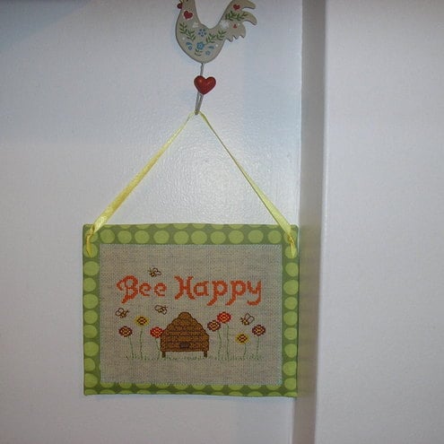 I have used bright orange thread, for the words 'Bee Happy and I've sewn a sweet bee hive, lot's of bees and colourful flowers.