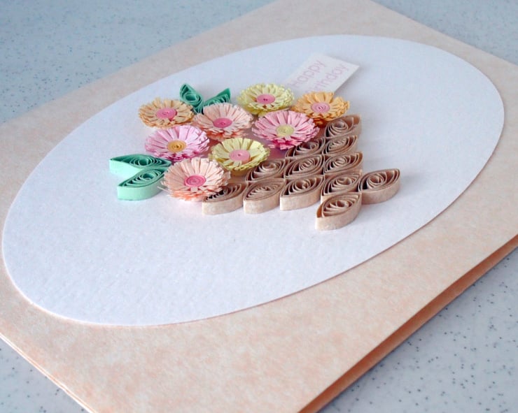 A quilled card design with a basket of quilling daisies in delicate, ice cream colours for a very special person. Perfect for helping a friend or family member celebrate a special birthday.