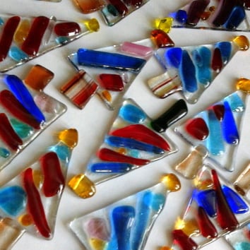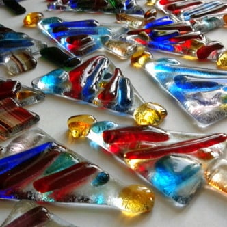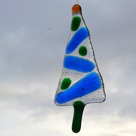 Fiddling around in my studio I was testing the compatibility of some recycled glass (not all glass fuses together in the kiln and will crack and fracture when heated up with glass that is not compatible). Instead of my usual test square I made a triangle shape, then thought oh Christmas Tree! My glass doodle came out very well and I popped another batch in the kiln yesterday. A very happy accident!