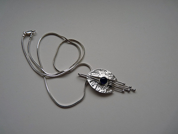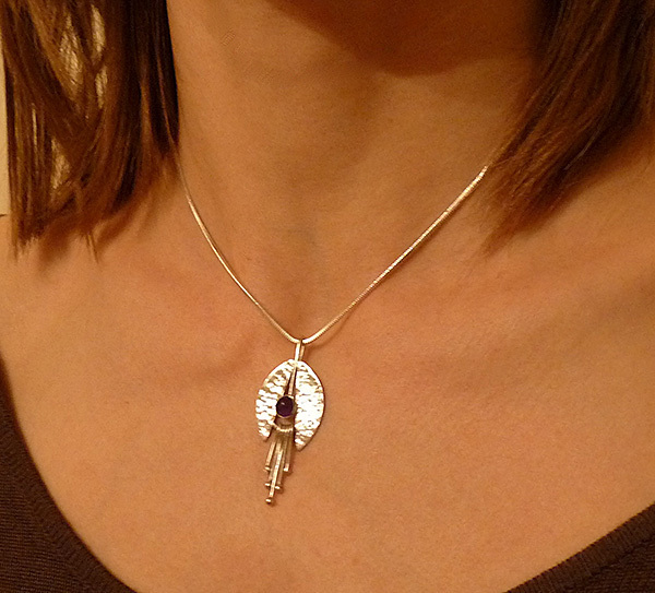 This lovely pendant with Amethyst has been entirely hand fabricated in sterling silver. It has been shaped, textured and polished to a bright and shiny finish. It hangs from a a sterling silver snake chain.