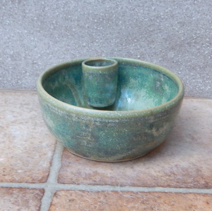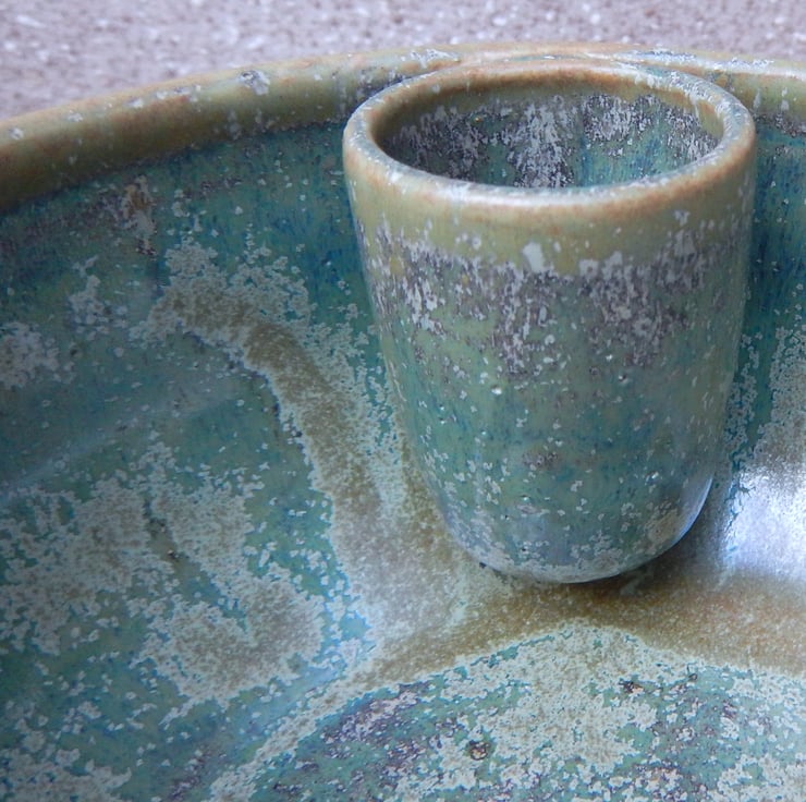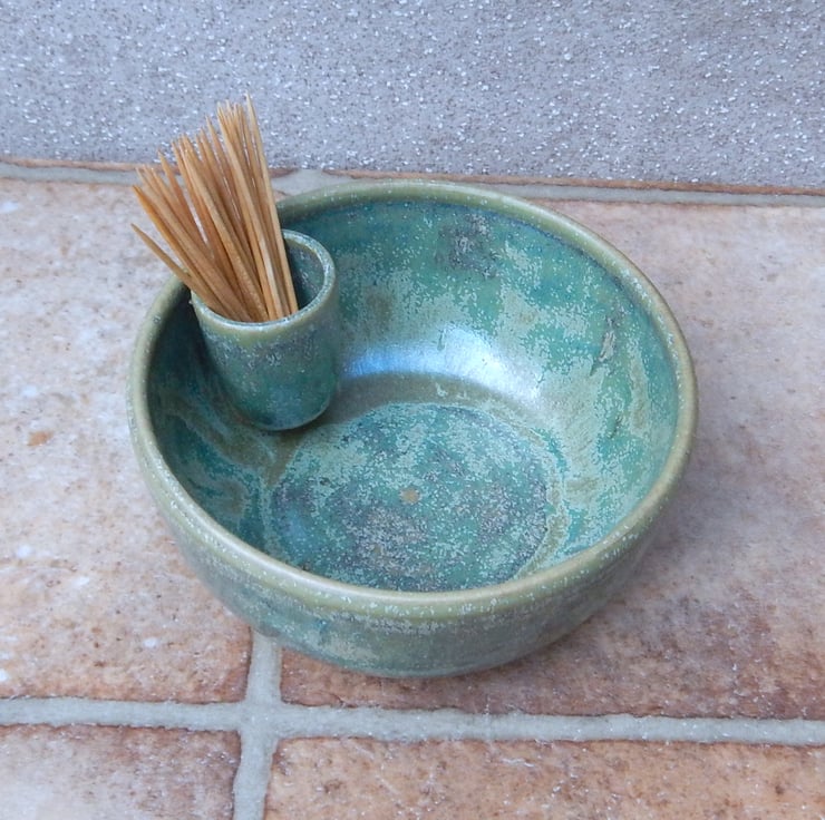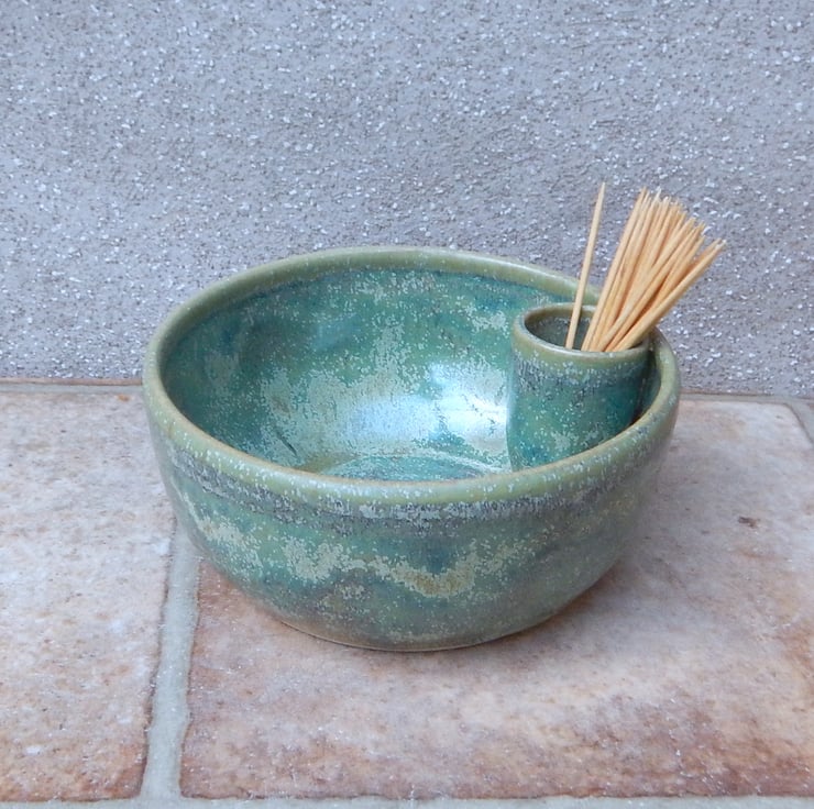 This olive dish was thrown by me on my pottery wheel using strong white stoneware clay and finished in a lovely mottled sage green reactive glaze.