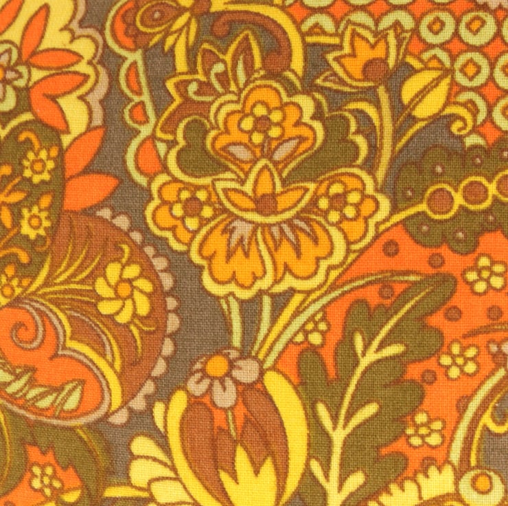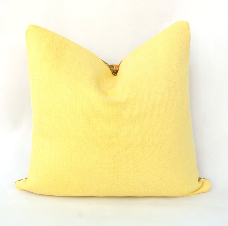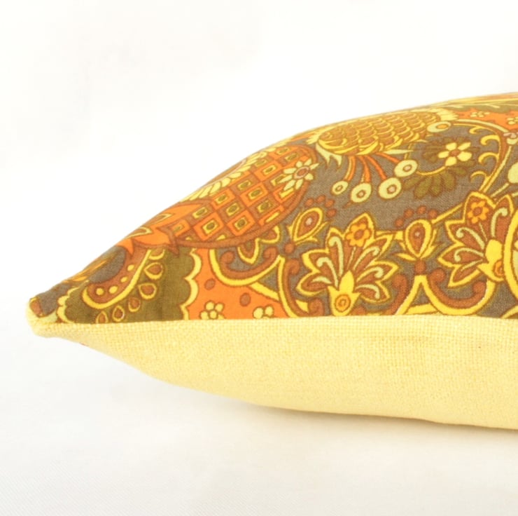 This is a very bright vintage cushion that will cheer up any room. It is made using a lovely piece of vintage fabric, the 'Longstock' design by Jonelle, dating probably from the 1970s. This fabric is found at the front of the cushion only and consists of flowers found in a rather psychedelic arrangement in vibrant colours, mainly greens, blues, browns and yellows. It is in very good condition considering it is a vintage piece of material, being made of 100% cotton. The back of the cushion consists of a modern piece of lemon yellow fabric, velvety to the touch and tweedy in its weave.