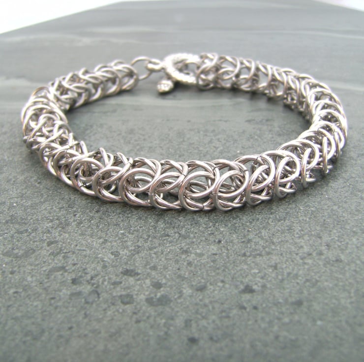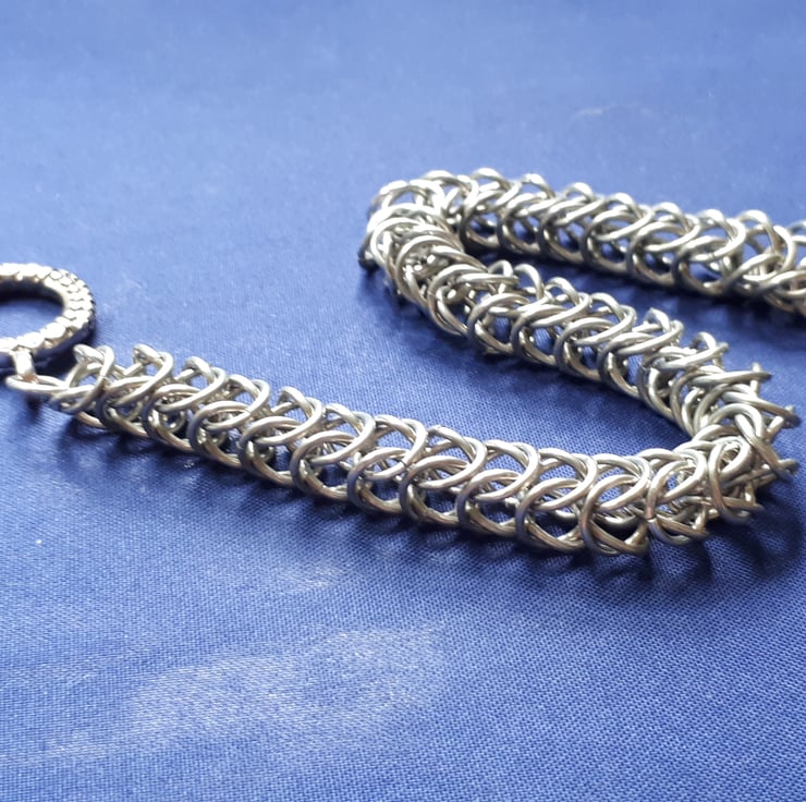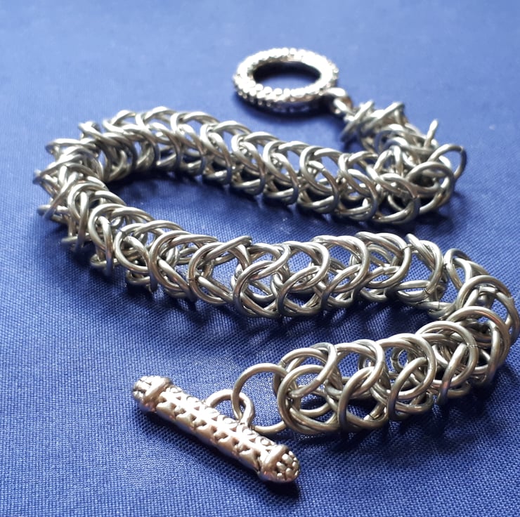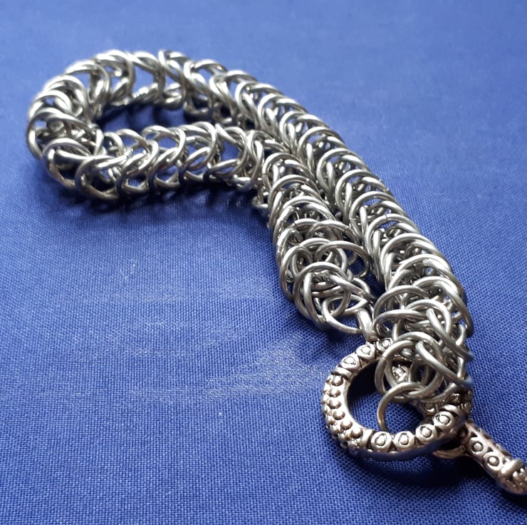 I created this 8.5 inch (22cm) unisex or gents / mens bracelet using bright aluminium jump rings & weaving them into box chainmaille. A dark grey silver tone toggle finishes the bracelet. Although it looks chunky, it is incredibly lightweight due to the aluminium used. The colour is a grey silver, looks shinier under light. I can customise the length if required, just send me a message. It will be sent in a velvet effect gift bag. For postage/returns, please view my profile.