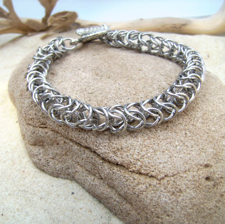 I created this 8.5 inch (22cm) unisex or gents / mens bracelet using bright aluminium jump rings & weaving them into box chainmaille. A dark grey silver tone toggle finishes the bracelet. Although it looks chunky, it is incredibly lightweight due to the aluminium used. The colour is a grey silver, looks shinier under light. I can customise the length if required, just send me a message. It will be sent in a velvet effect gift bag. For postage/returns, please view my profile.