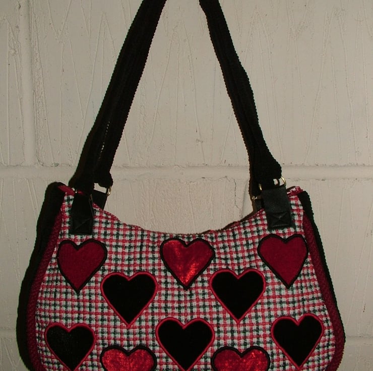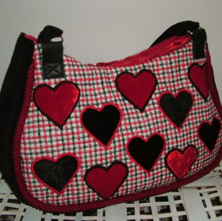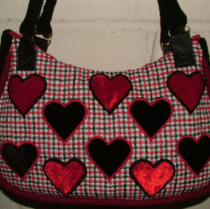 THE FRONT IS A HAND CRAFTED GINGHAM EFFECT PANEL, MADE FROM A WHITE COTTON FABRIC SEWN INTO WITH RED AND BLACK THREADS. THIS HAS THEN BEEN OVERLAYED WITH A MIXTURE OF RED AND BLACK VELVET HEARTS, EACH SEWN ON WITH CONTRASTING THREAD.