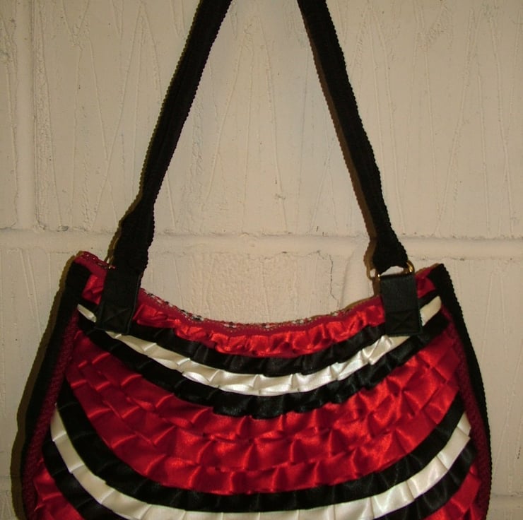 THE BACK HAS BEEN CREATED BY THE FOLDING AND LAYERING OF RED, CREAM AND BLACK SATIN RIBBON, PRODUCING A SHIMMERING PANEL. OF COURSE IT DOES NOT HAVE TO BE THE BACK, YOU CAN WEAR YOUR BAG HOWEVER YOU PLEASE.