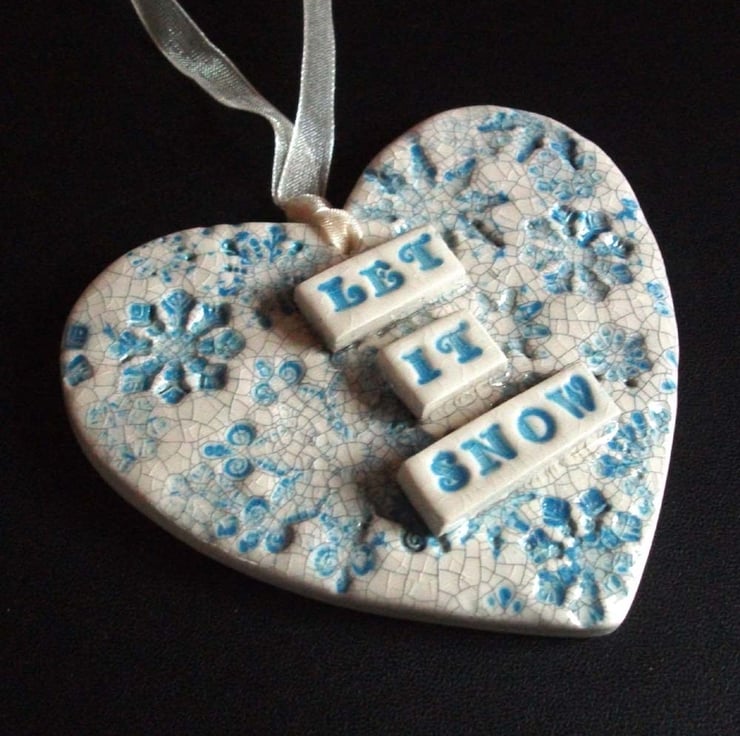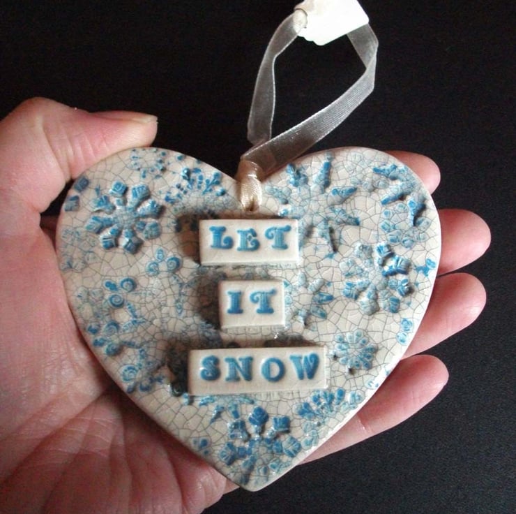 This ceramic heart is made from white earthenware clay and decorated with the words Let it snow. It has a blue snowflakey background finished off with a crackle glaze for a shabby chic look.