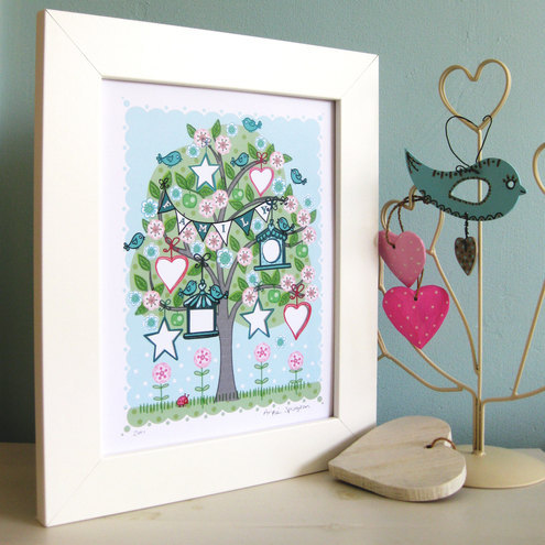 My fresh & funky family tree is created by my usual 'inky doodle, scan in, digitally colour then print onto a lovely paper' method.