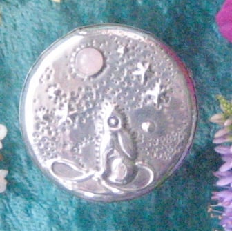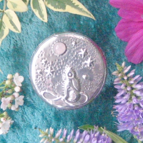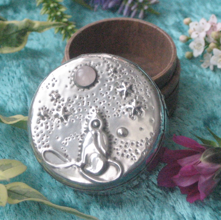 This little rustic wooden box has been transformed with a lid of hand-tooled pewter depicting the moongazing hare of legend. A rose quartz cabochon represents the moon. It is 26mm high and 36mm across. Perfect for tiny treasures.