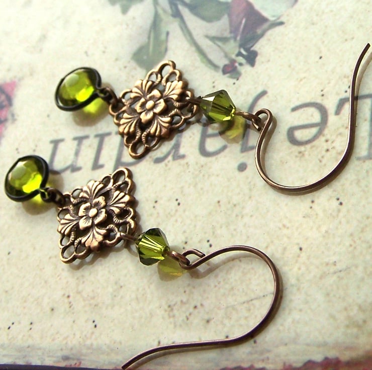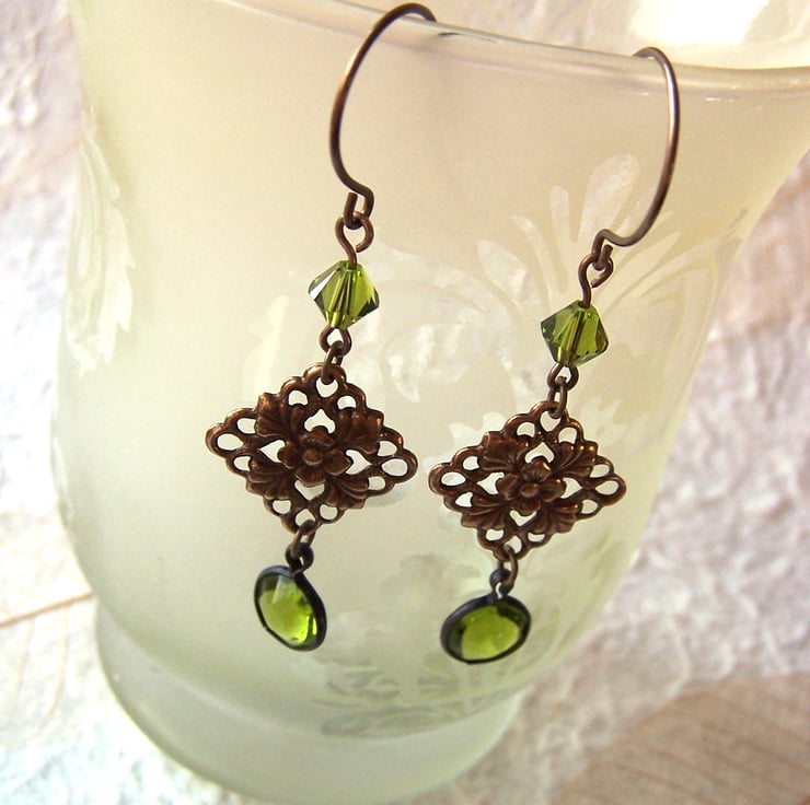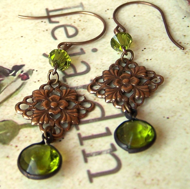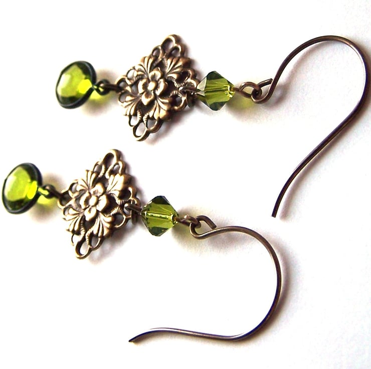 To make the dangles for these earrings, I have wired together a green Swarovski crystal bicone bead, an antique gold tone filigree diamond, and a pretty little green glass pendant.