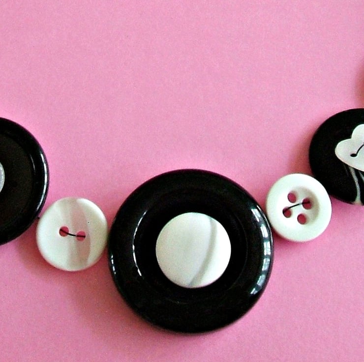 A selection of vintage and new buttons in a classic combination of black and white adorn this necklace. There are some really nice buttons here - my favourite is the teeny little white heart shaped one! Truly one of a kind as all the buttons are selected individually from my ever-growing stash.
