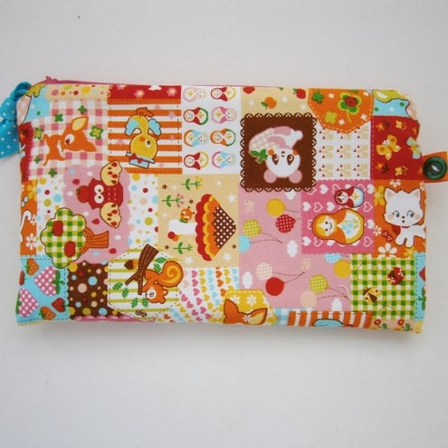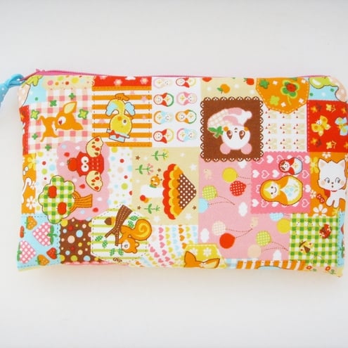 Cute Little Animals make up bag / pencil case with contrasting zipper, ribbon lining