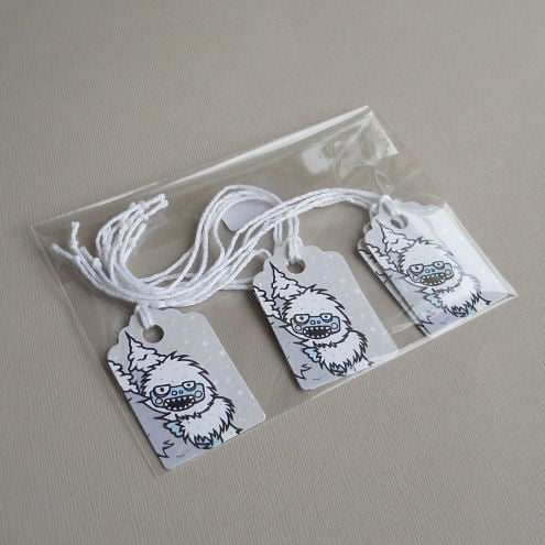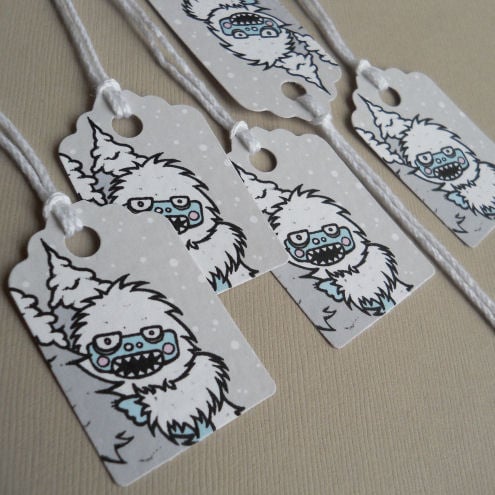 a pack of 5 tags, featuring my original illustration of a jolly yeti in the snow. cute and quirky, this design is one of my original hand drawings; it is scanned into the computer, coloured digitally, and then printed onto good quality textured white card (300gsm), and the tag shape is then punched out.