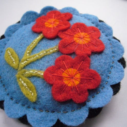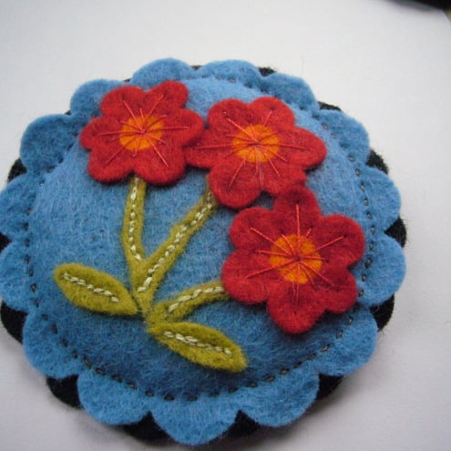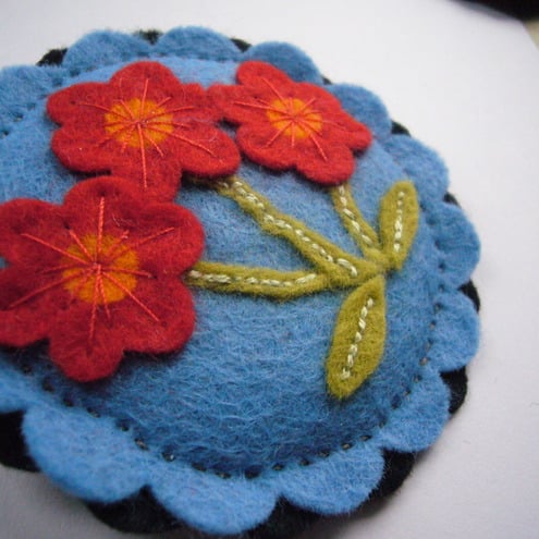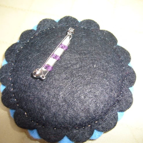 The flowers are sewn onto a 70mm blue felt background which is stitched to a black backing piece - this has the 30mm brooch pin securely attached to it. Inbetween the layers is a little wadding and a circle of cardboard to stiffen.