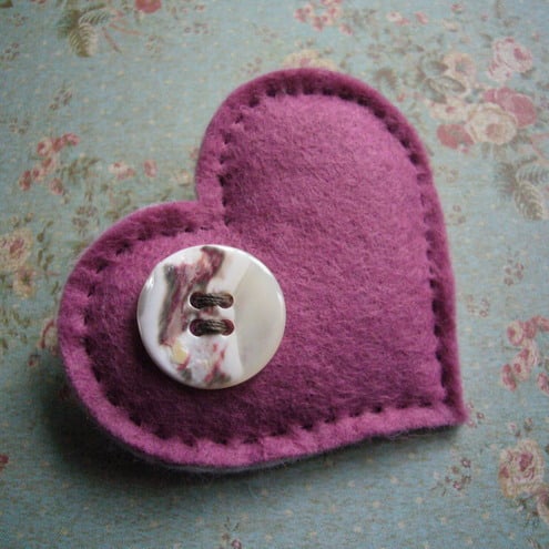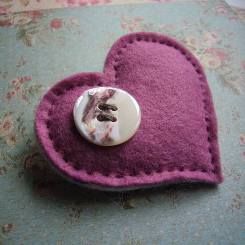 Inside the heart is a little wadding and a layer of cardboard for rigidity so the brooch will hold its shape when you wear it. It measures 50mm from middle dimple to its point and c.65mm across