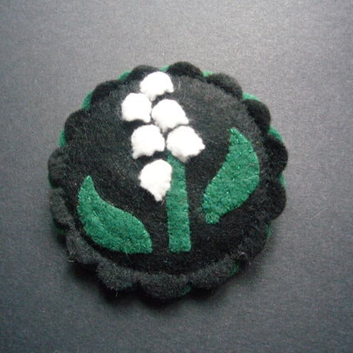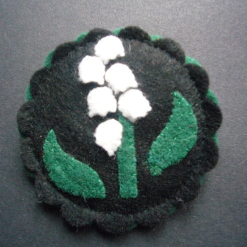Little white 'bells up a dark green stem adorn this brooch. It is completely and carefully handstitched.