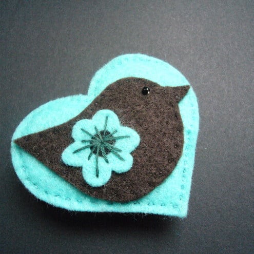 A Brown Bird embellished with a Green embroidered flower perches happily in this Jade Green Felt Heart Brooch This item is completely (and lovingly) hand sewn - ALL stitches are visible!