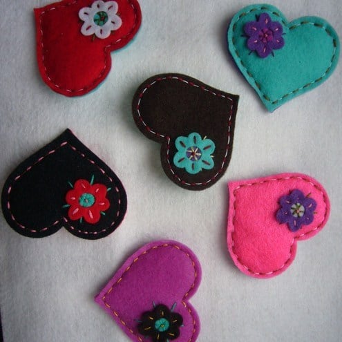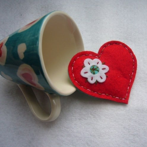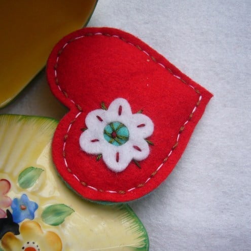 A white felt & embroidered flower with a green centre embellished with a french knot decorates the heart.