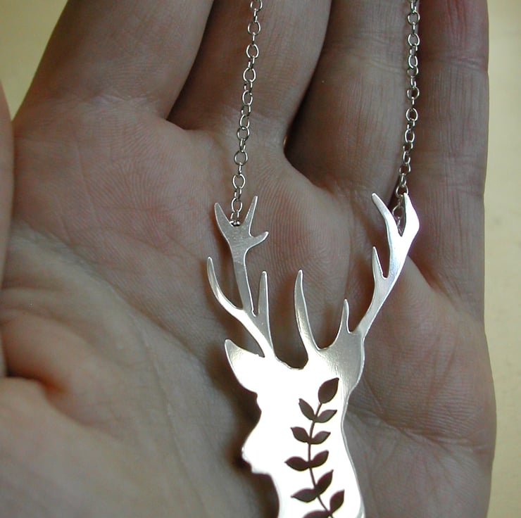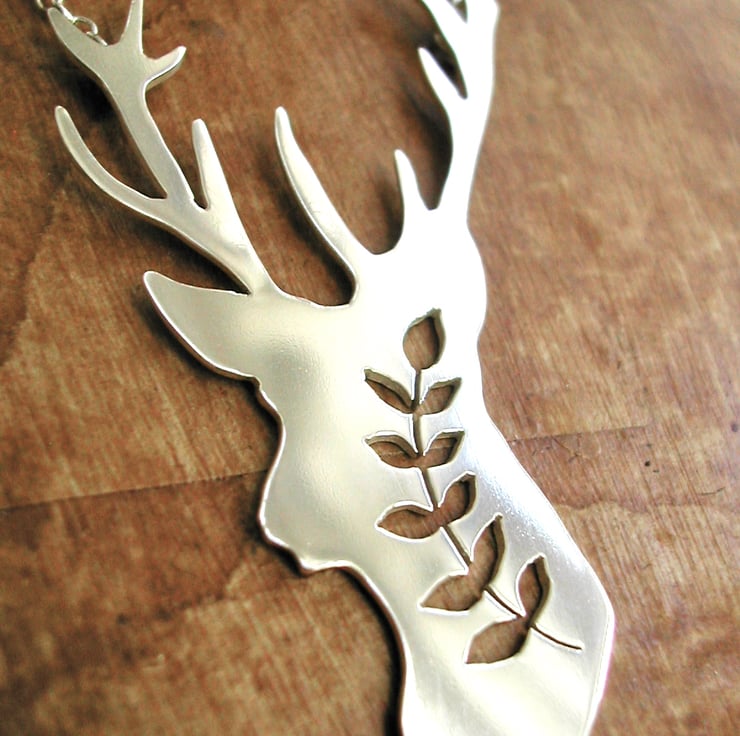 Handmade silver stag necklace with a leaf pattern cutout and a polished finish.