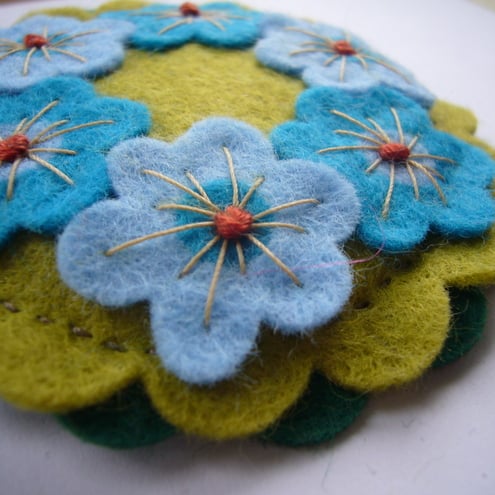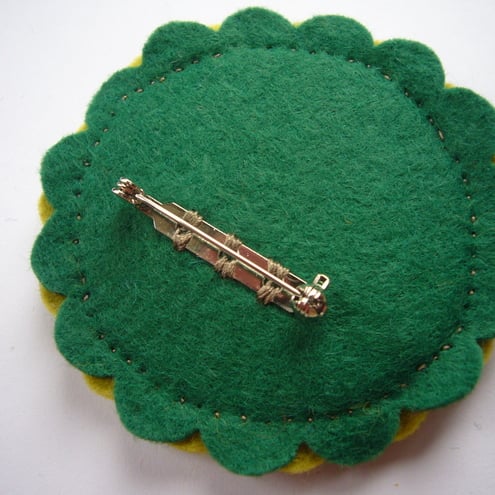 The flowers are sewn onto a 70mm moss green felt background which is stitched to a green felt backing piece - this has the 25mm brooch pin securely stitched to it. Inbetween the layers is a little wadding and a circle of cardboard to stiffen.
