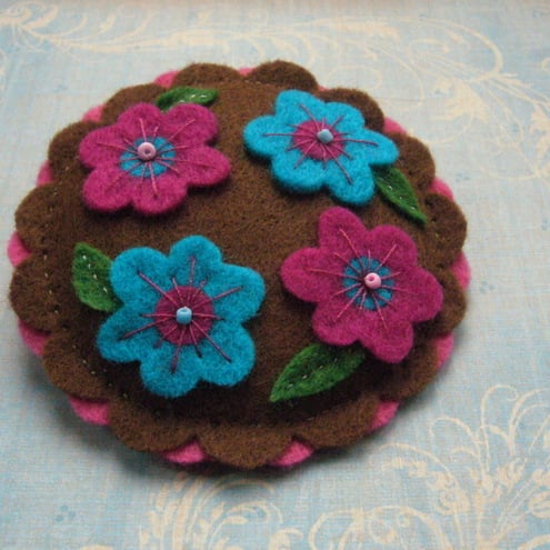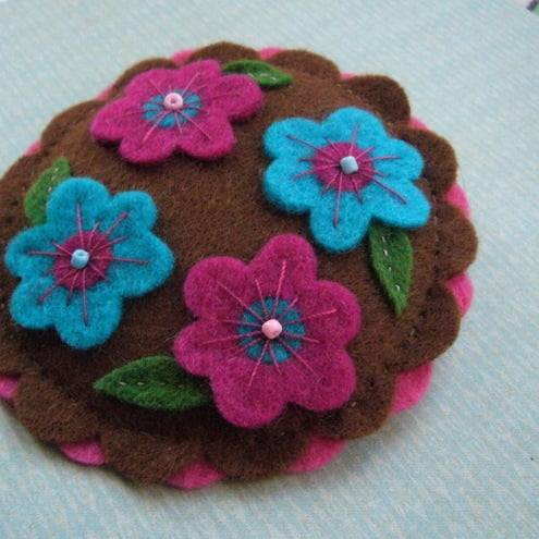 The flowers are sewn onto a 70mm brown felt background which is stitched to a bright pink backing piece - this has the 25mm brooch pin securely stitched to it. Inbetween the layers is a little wadding and a circle of cardboard to stiffen.