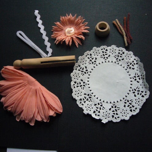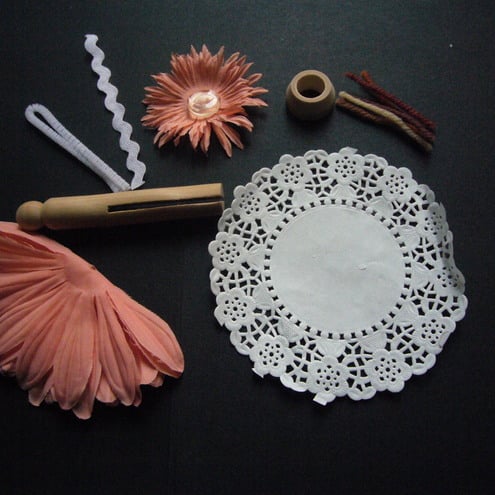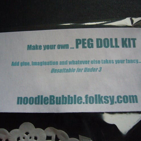Kit contains a dolly peg and stand , paper doily, pipe cleaner, few layers for a flower dress and smaller flowers for tops or hat with a little clear button. Few bits of wool for hair, RicRac for belt or embellishment - no instructions so just add imagination, pen for face and a little glue.