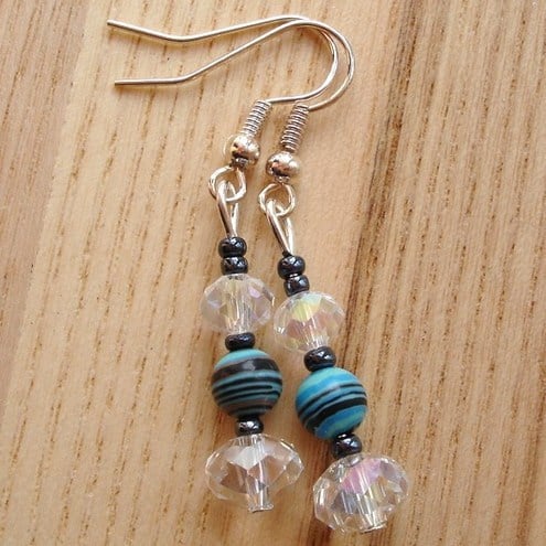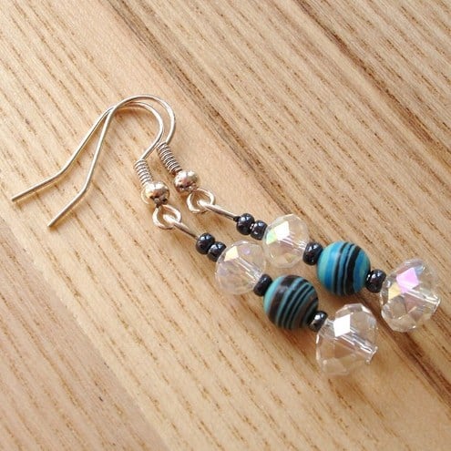 These sparkly earrings feature some lovely crystal and multicoloured striped turquoise beads. They are hung on silver plated headpins and finished off with teeny graphite glass seed beads. Really sweet! Lightweight and great for everyday wear.