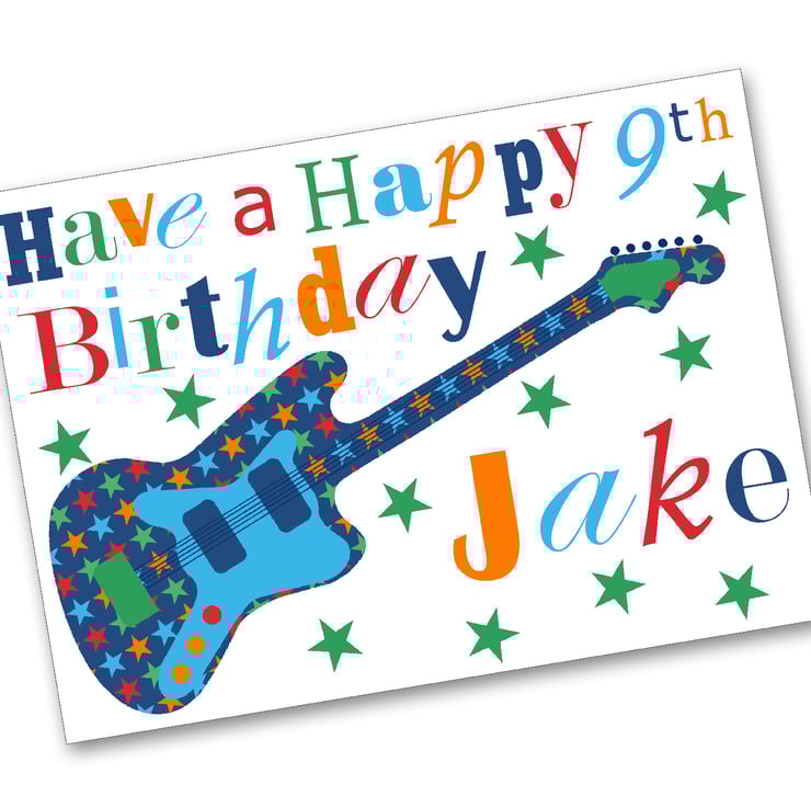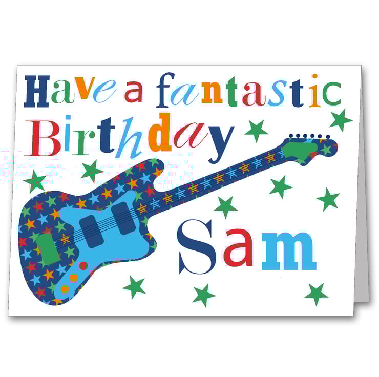 The perfect birthday card for any music loving boy or teenager. This personalised birthday card features a guitar with any message you choose and the recipient's name. I can also add the age. So if you would like to wish the recipient an awesome, epic, wicked, fantastic or just a Happy Birthday, I can amend the card accordingly ! Just have a look at the photos for some ideas.