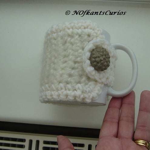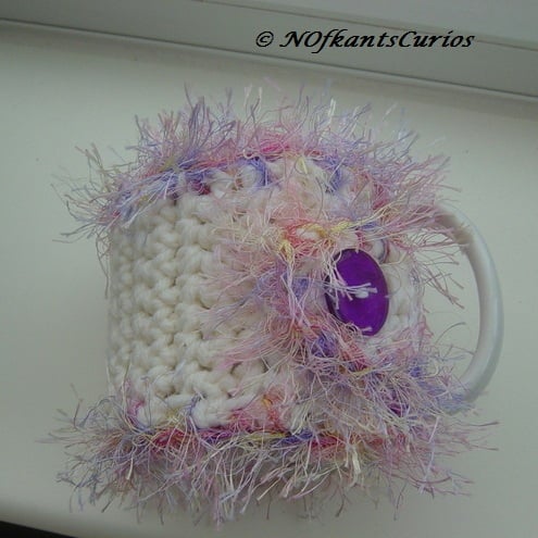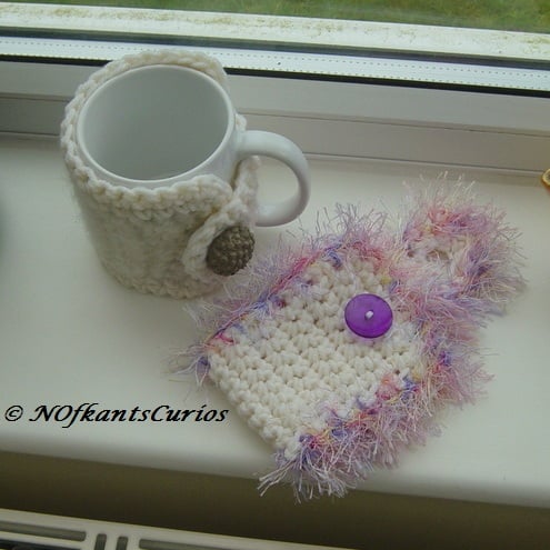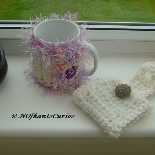 His and Hers Yarn Mug Cosies, crocheted in 100% wool, 100% filiment Acrylic and mohair yarns and fastened with large and chunky buttons.