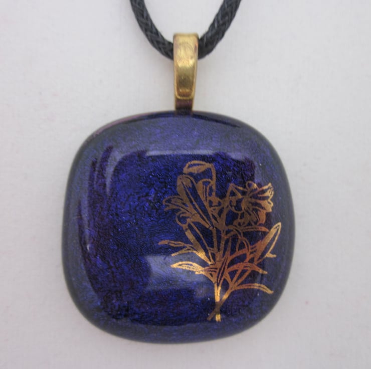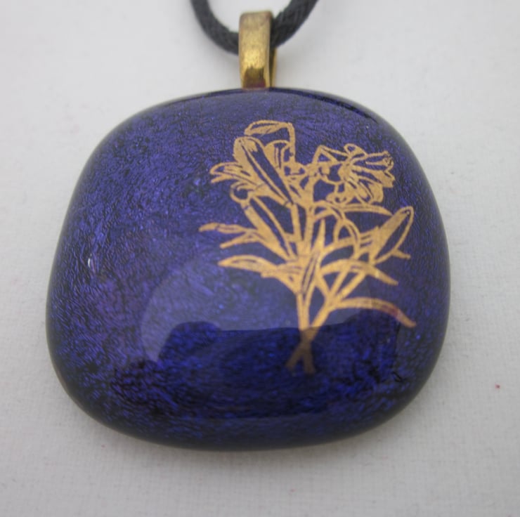 This glass cabochon was fused by me. It has a beautiful deep purple dichroic shimmer on a black glass base. It is approximately 1 inch across. It is far more beautiful than in the photograph, with a gorgeous deep glistening - it is impossible to do justice to the shimmer. On the surface are 22 carat gold lilies. Please note that this is not a sticker but a real gold glass decal. This pendant has a gold coloured metal bail.