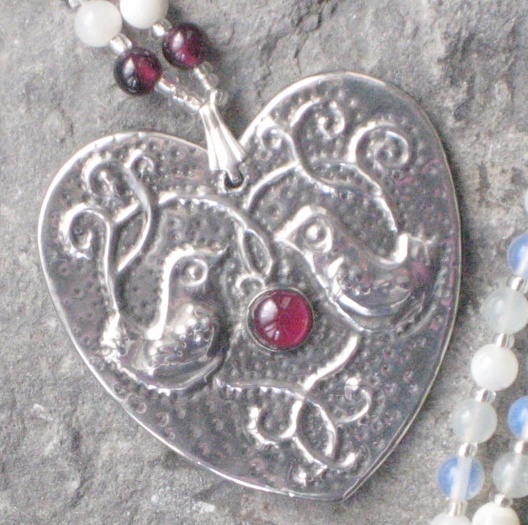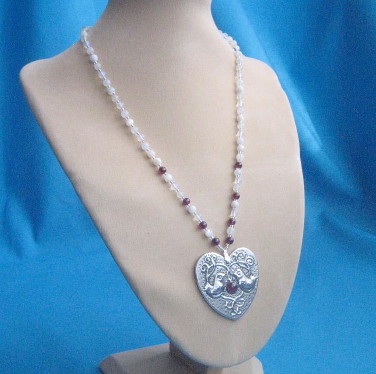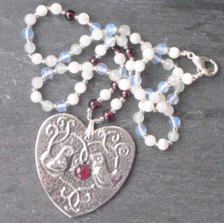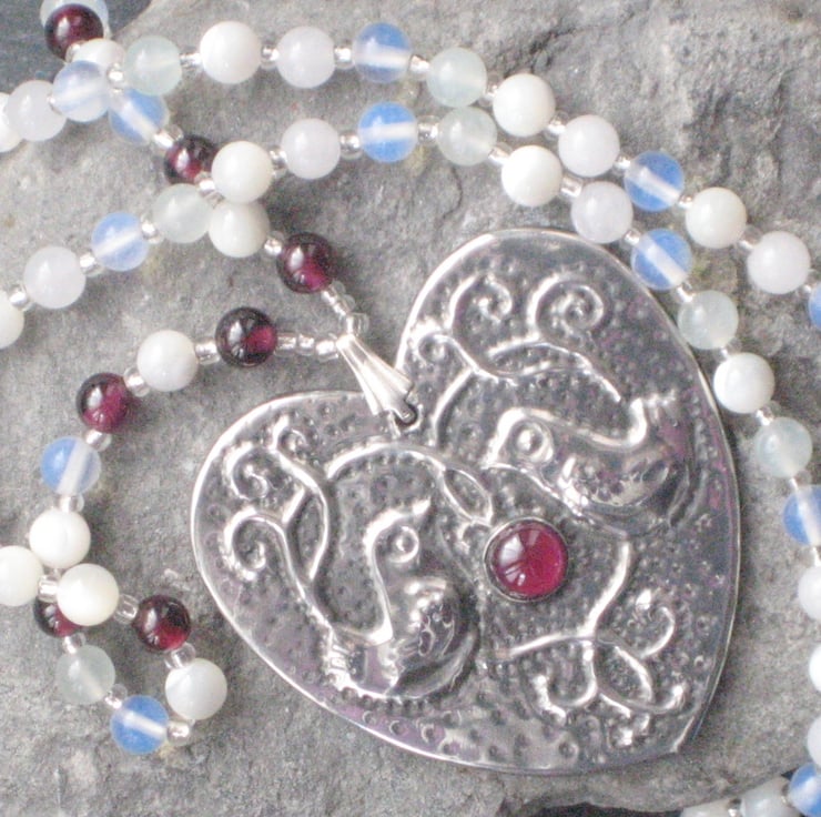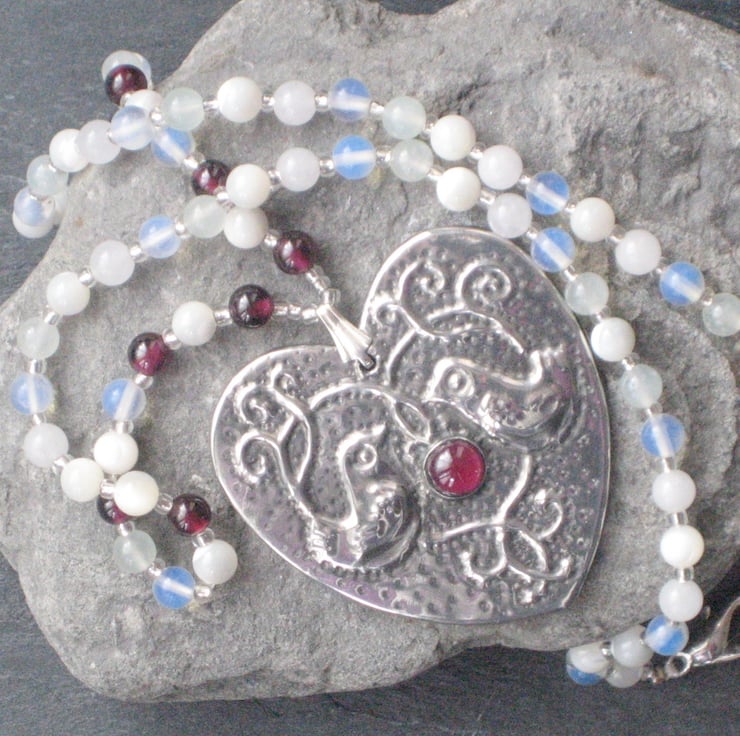 This lovely necklace has been made with beads of genuine garnet,rainbow moonstone,pale jade and mother of pearl. It features a pendant, handmade from lead-free modern pewter, with a beautiful garnet cabochon.The necklace is 440mm in length,and the heart shape is 40mm across. Please note that the display stand is smaller than lifesize