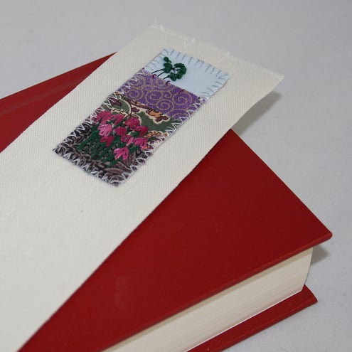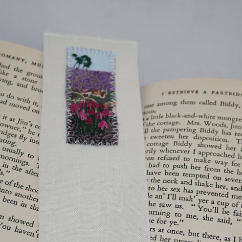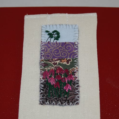 A panel, of heather - hand embroidered on an appliqueed background, has been slip-stitched to the top of this linen bookmark.