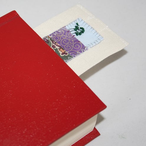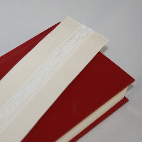 The bookmark has been stitched from a cream, linen/viscose fabric, backed with heavy iron-on interfacing. The centre seem at the back of the bookmark is neatened with white lace. Ribbon tails are stitched into the base of the bookmark.