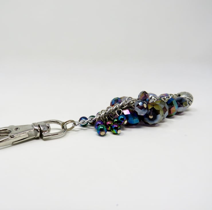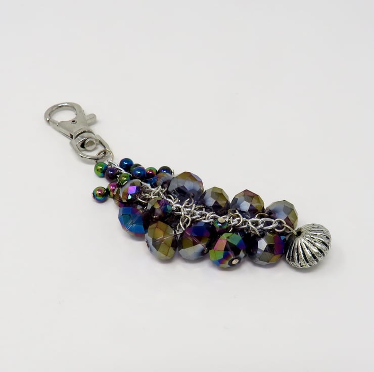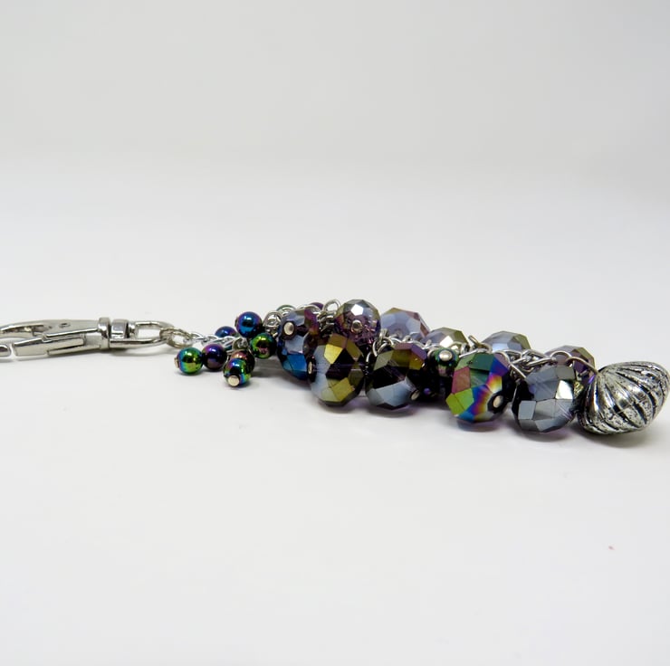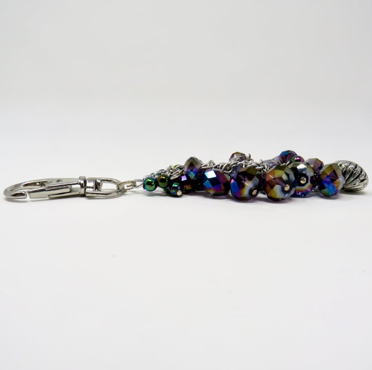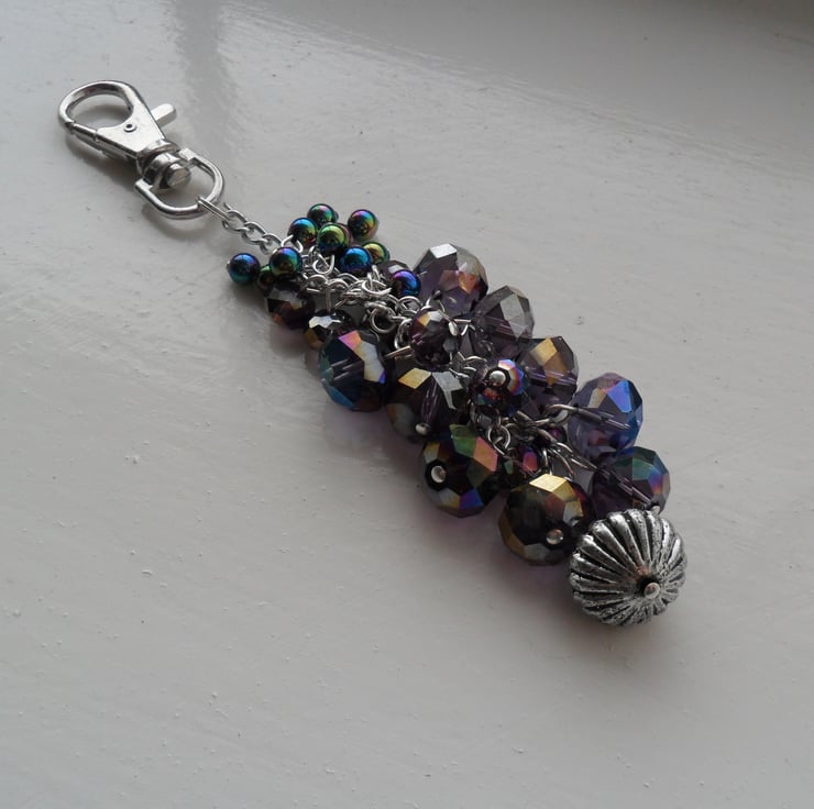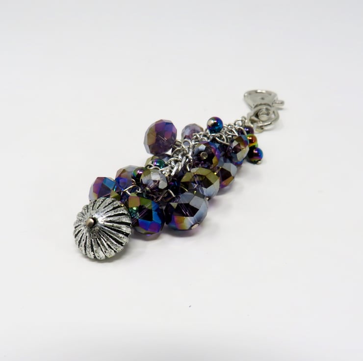 A lovely handmade bag charm in shades of purple. on a silver coloured chain and a silver coloured metal keyring clip.