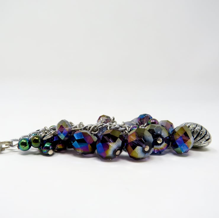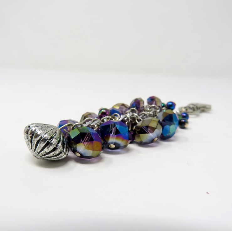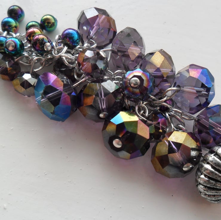 It is made from purple faceted crystal beads in two sizes and and small pearlescent purple beads, with a silver coloured charm at the bottom.