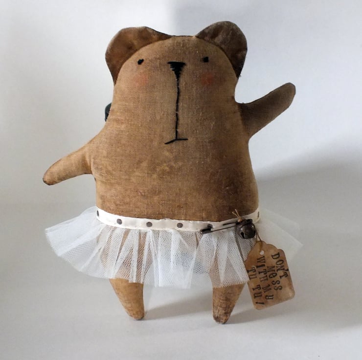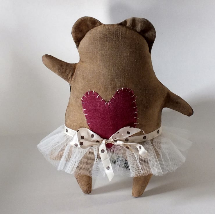 This little bear is made from linen,coffee and cinnamon dyed ,then sanded back for primitive loveliness.She had embroidered features and flushed cheeks (all that twirling - couldn't spell the word beginning with p)! The tu-tu is made from tulle with a pure silk vintage band and the heart on the reverse is raspberry coloured linen ,randomly stitch with linen thread.