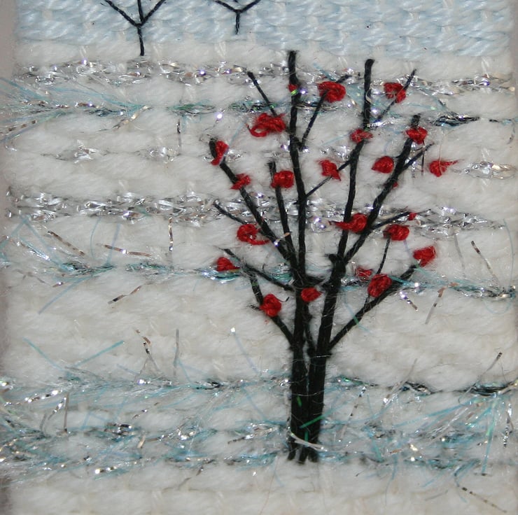 A wintry landscape, woven on a miniature scale and finished with hand embroidery - presented as a brooch - the second in this series.
