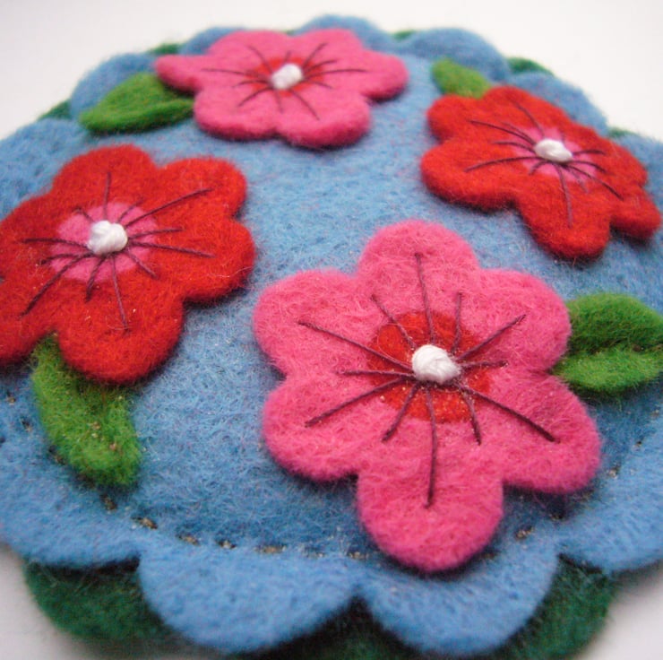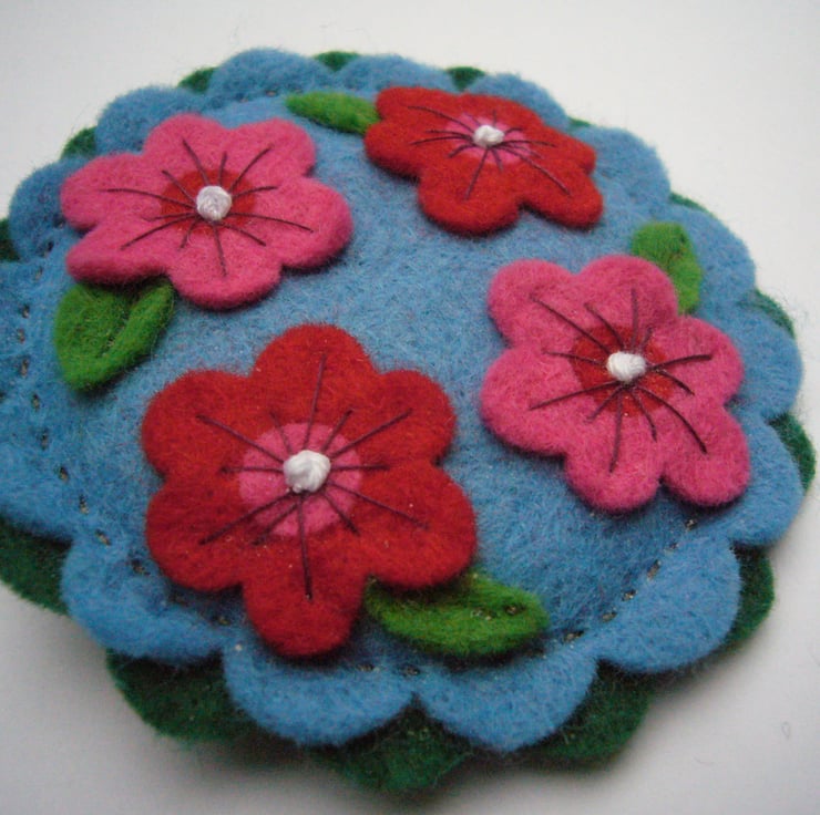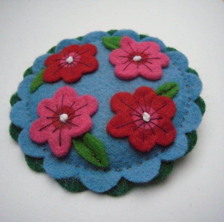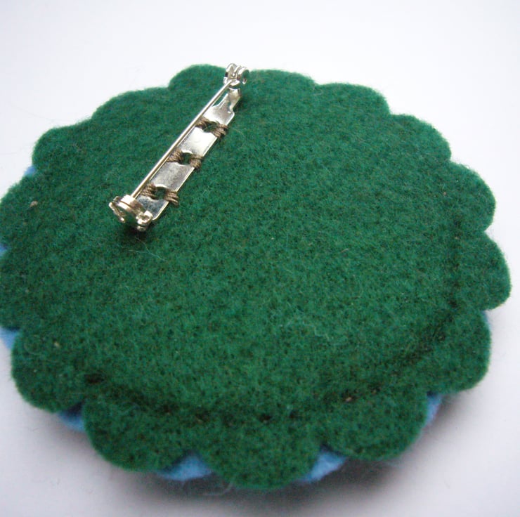 The flowers are sewn onto a 70mm blue felt background which is stitched to a dark green backing piece - this has the 25mm brooch pin securely stitched to it. Inbetween the layers is a little wadding and a circle of cardboard to stiffen.