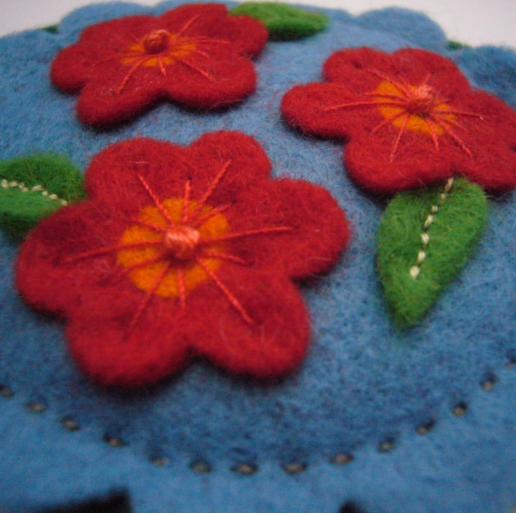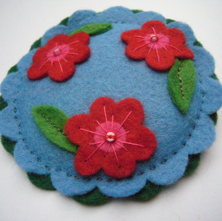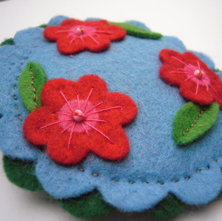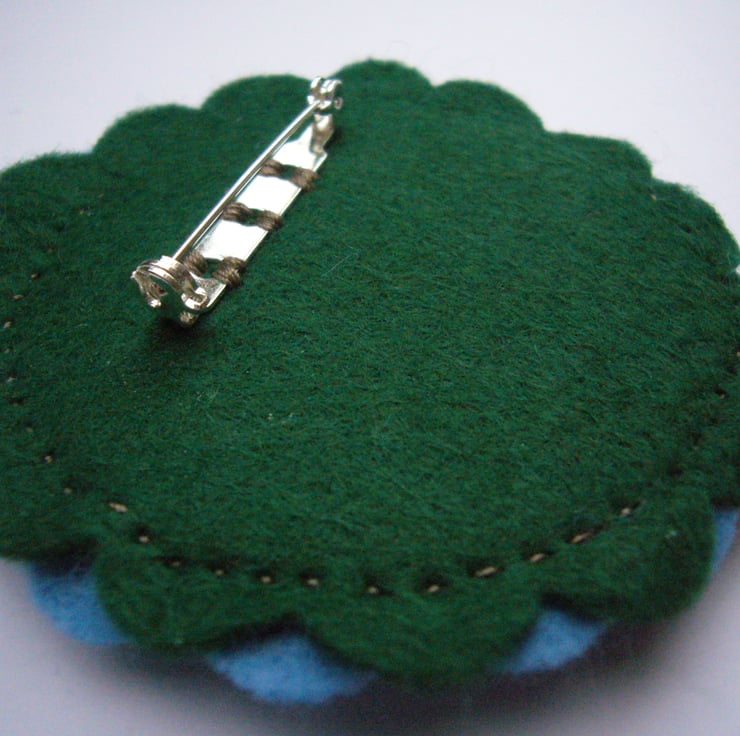 The flowers are sewn onto a 70mm blue felt background which is stitched to a green backing piece - this has the 30mm brooch pin securely attached to it. Inbetween the layers is a little wadding and a circle of cardboard to stiffen.