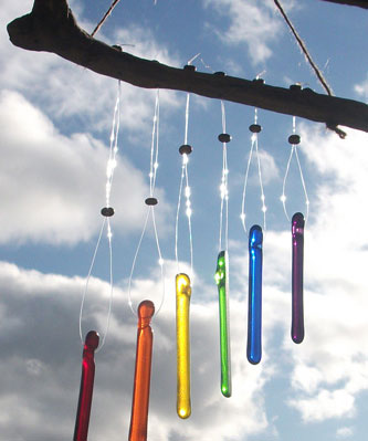 The glass has been annealed to ensure that it is strong and will survive when the chimes knock against each other. The windchimes are threaded on strong nylon thread and firmly attached to the drift wood.