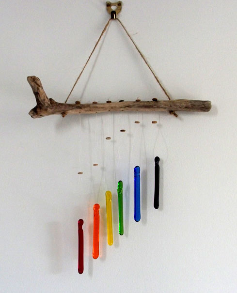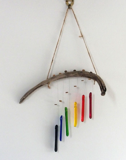 Six 3.5" long strips of glass in the colours of the rainbow are suspended from a piece of driftwood.